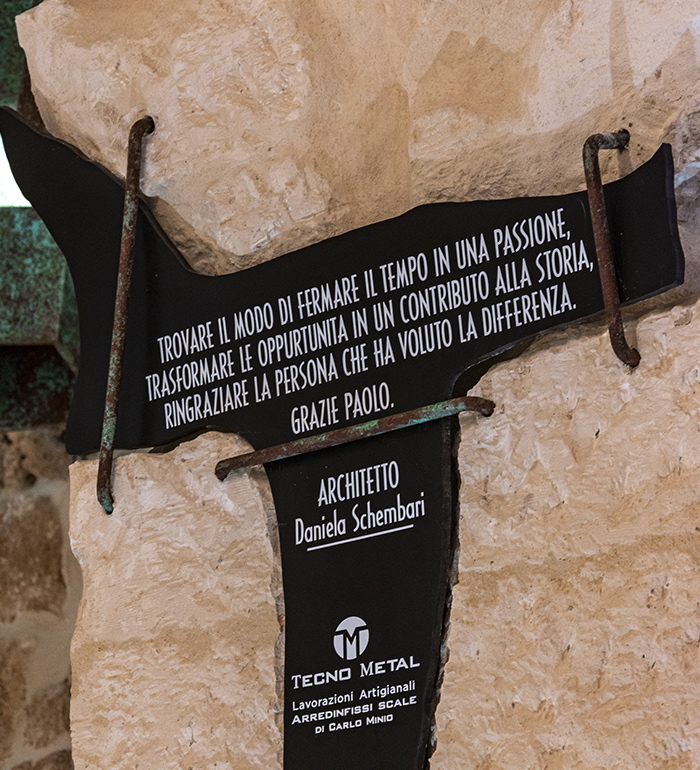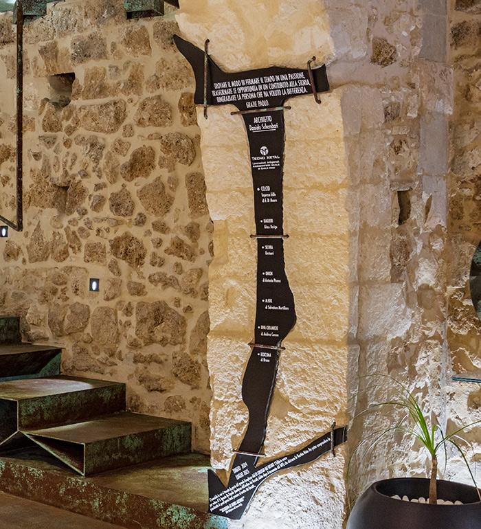 Other plaques incorporate metal inserts finished with the same artistic oxidation techniques in copper and Corten tones, creating a visual dialogue between different materials and ensuring conceptual continuity throughout the project.