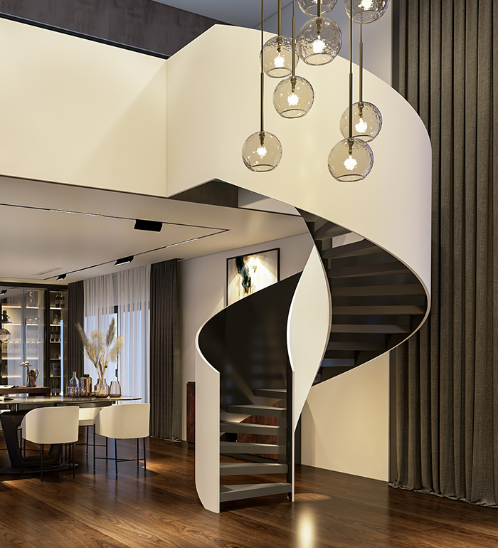 Staircase with central self-supporting structure for greater resistance and structural stability.