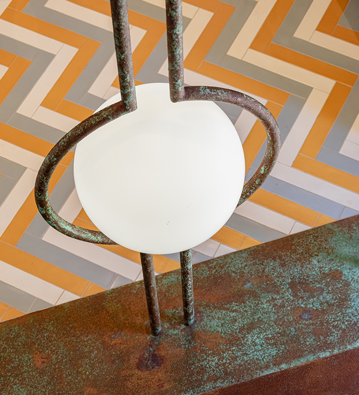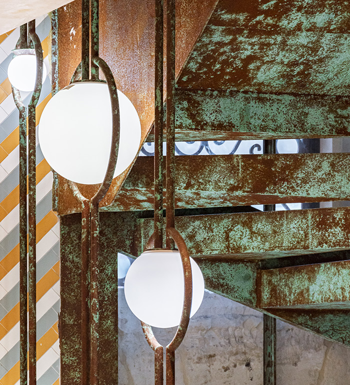 The materials and finishes follow the same artistic philosophy as the staircase: treated through artistic paint techniques and oxidation of copper and corten surfaces, with patinas that evoke time, the sea, and the historic memory of the old tuna fisheries.