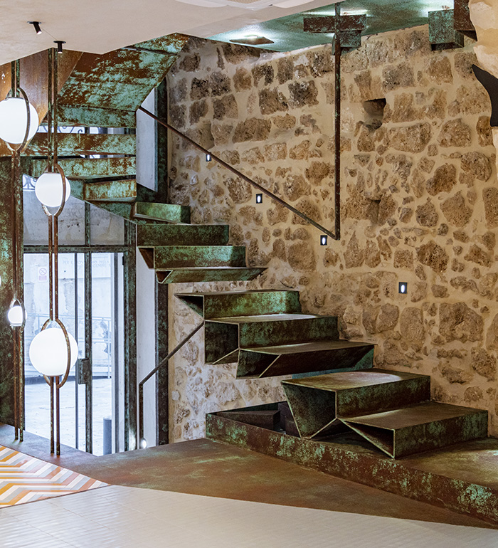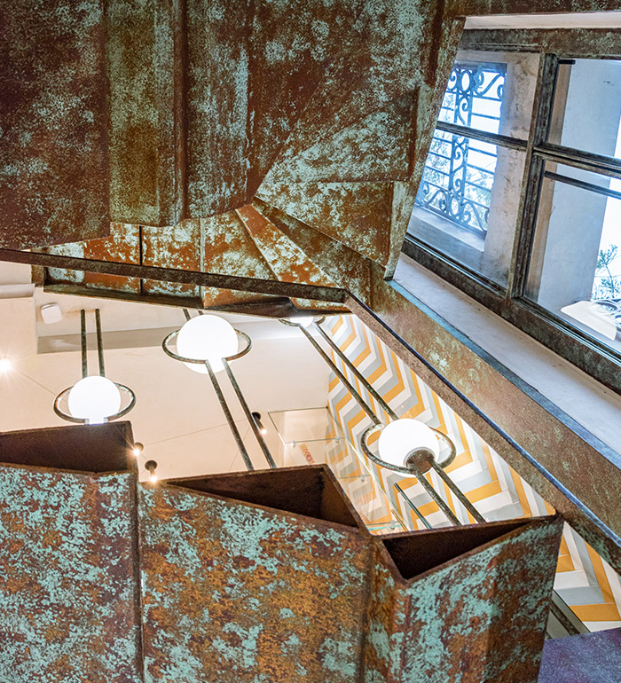 Ogni elemento è il frutto di artigianalità e ricerca progettuale, dove lo studio della materia e delle superfici chimico-fisiche del ferro permette di trasmettere emozione e memoria, trasformando la scala in un’esperienza sensoriale e poetica, tra movimento, luce, riflessi e ricordo storico.