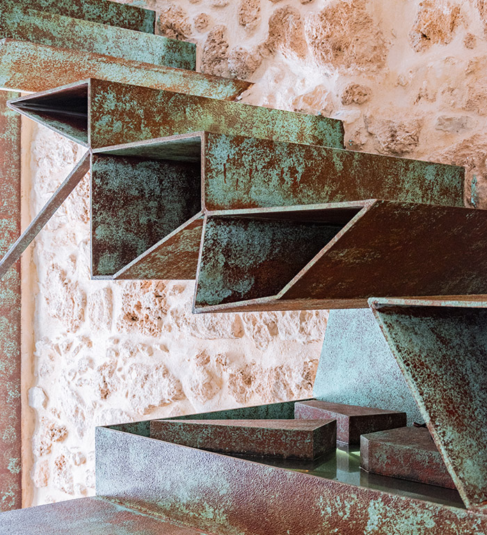 La scala è realizzata in acciaio su misura, con gradini sospesi e trattata con tecniche di verniciatura artistica, ossidazione delle superfici in Rame e Corten, per restituire la patina del tempo, le sfumature calde e la texture materica delle tonnare storiche.